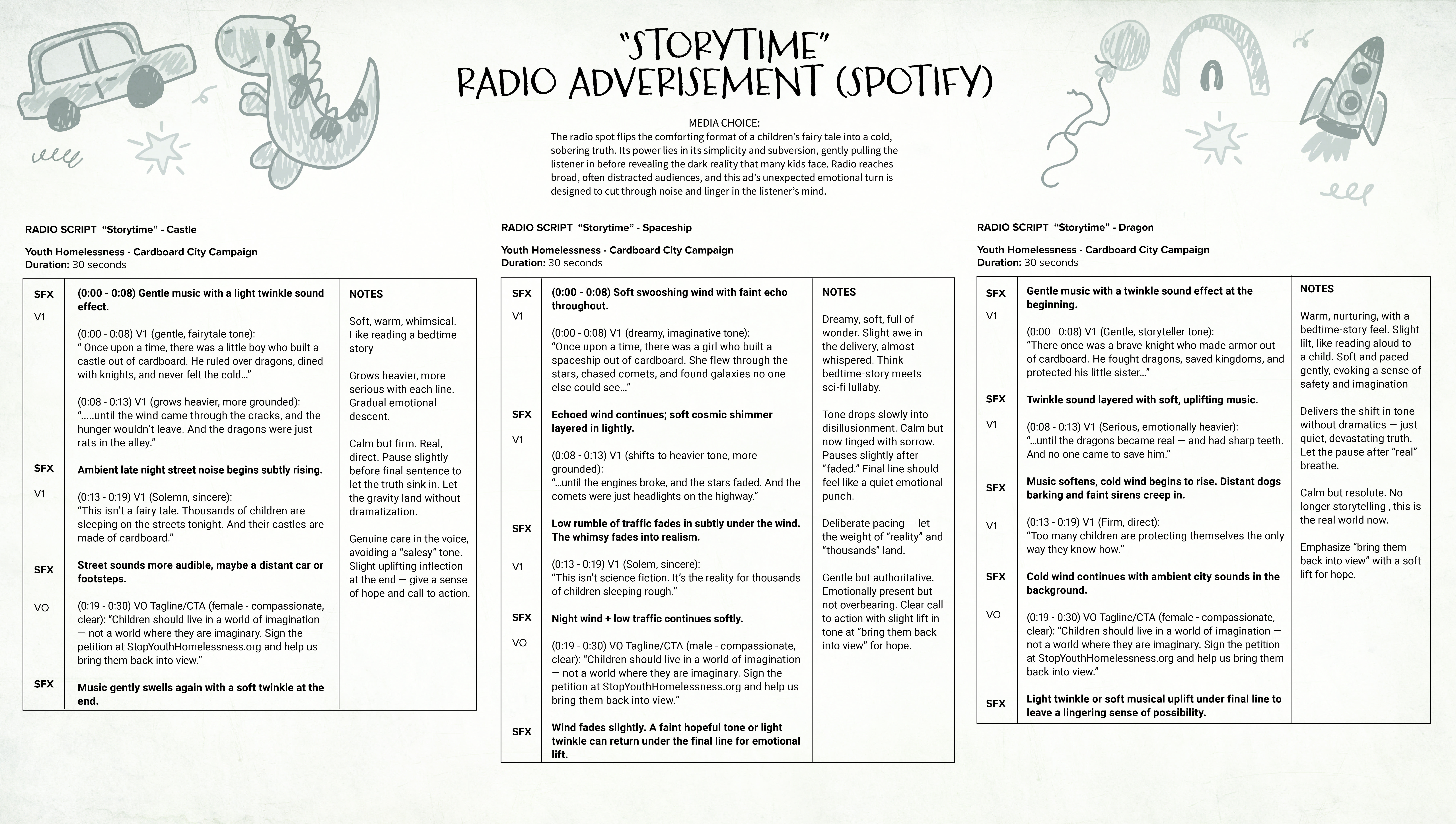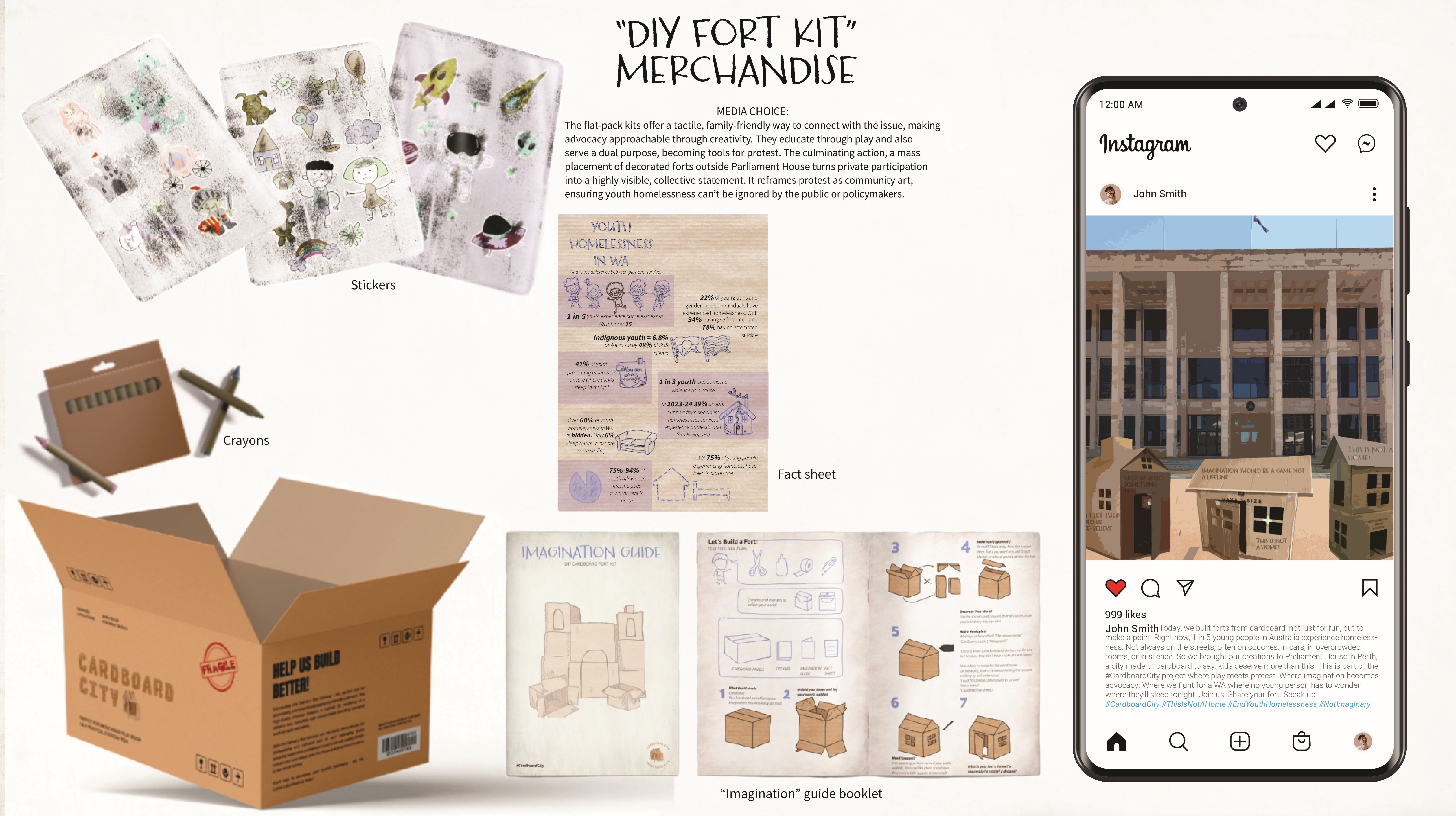 The campaign is built on this emotional contrast. “Cardboard City” transforms the playful into the powerful, drawing people in with childhood nostalgia, then confronting them with the harsh realities of youth homelessness. The metaphor becomes a bridge: between misunderstanding and empathy, invisibility and action. The campaign unfolds across multiple touchpoints to shift perception and drive direct action, encouraging the public to sign a petition demanding policy change and increased support for vulnerable youth.