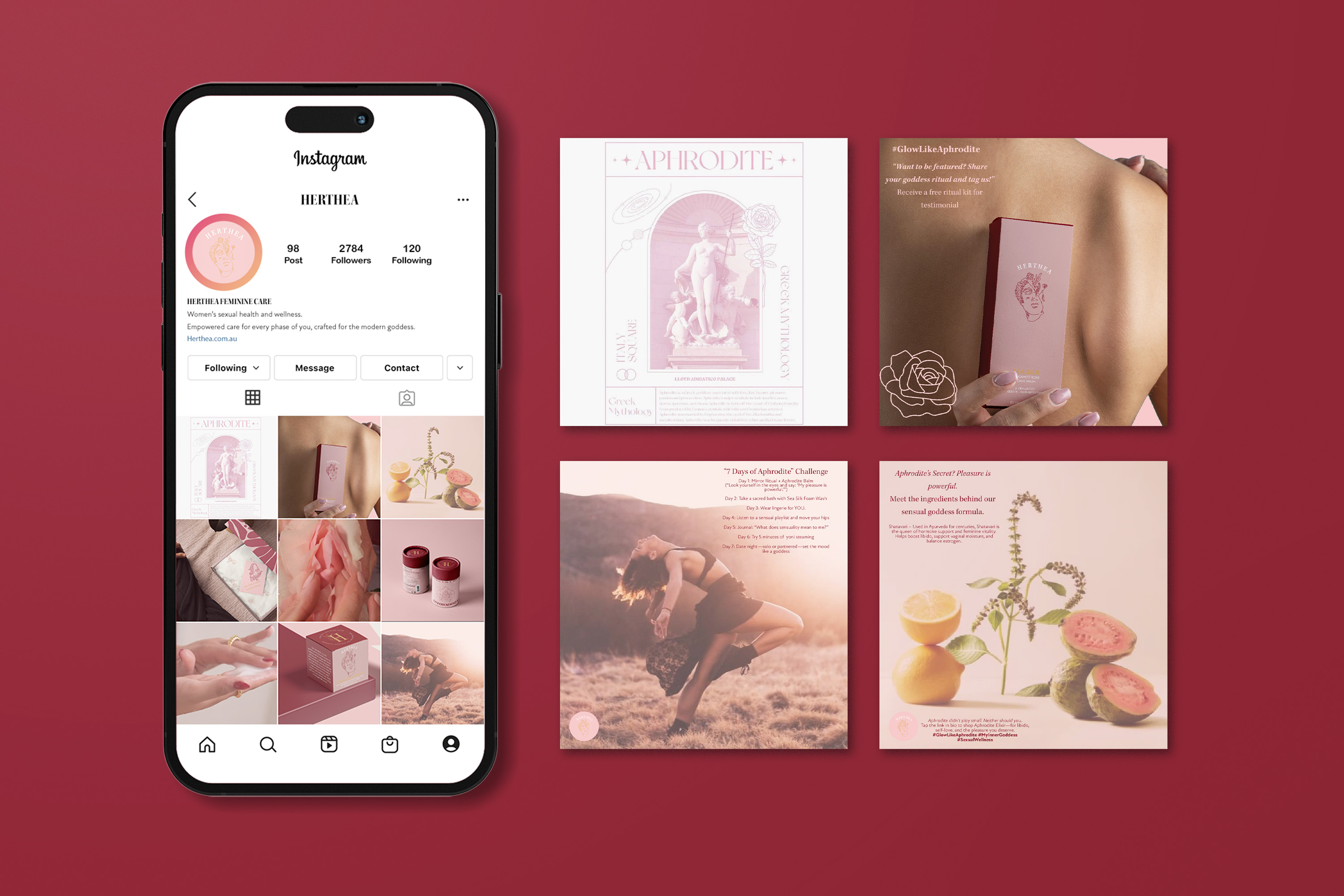 Rooted in the strength of Greek goddesses, the brand name blends “Hera” and “Thea,” symbolizing wisdom and sacred femininity, while its visual identity features an abstract goddess entwined with natural elements, evoking grounded elegance. Sustainable, reusable packaging with floral-inspired details and textured hessian bags enhances both beauty and function. Each product line aligns with a goddess, Aphrodite (pleasure), Selene (hormonal health), and Hera (motherhood), with tailored palettes and storytelling. Herthea’s Instagram strategy deepens connection through goddess spotlights, ritual challenges, ingredient stories, and UGC, creating a soft, authentic, and empowering space for women seeking holistic wellness.